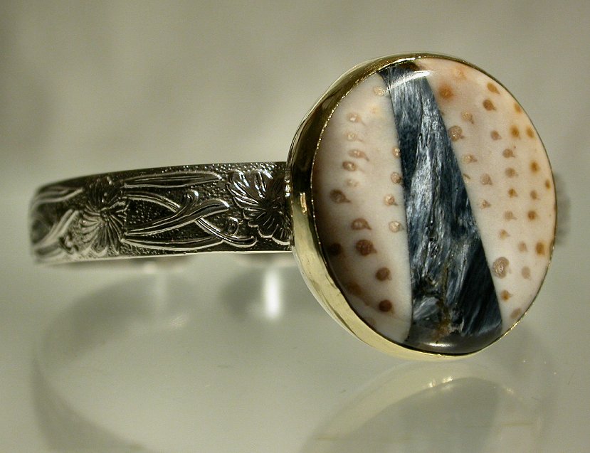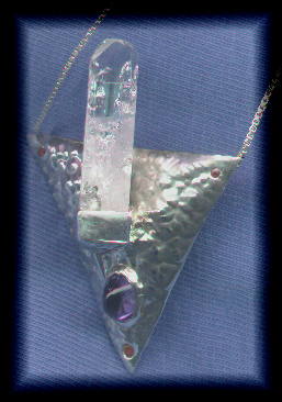 Click Here to see back view Click Here to see sacred spiral Custom Amulet Many Rivers includes ancient primordial stones recombined to create proportions and juxtapositions never found before. The sugilite head stone is to keep your crown chakra open and consciously connected with SOURCE... There are 4 colors of gold including 22k Santa Fe yellow bezels. Blending with the flowing of 3 colours from your past relationship are to remind you that life is never what it seems but it is all ways good.... The body stone is centered on petrified palmroot with Australian tiger iron on both sides. The erotic V is the entrance to this physical plane of existance. It is a natural focus for our humanness. The sacred spiral on the right shoulder is acknowledgement of your love of the legless ones who frighten and teach wisdom. All elements are combined in my vision of you and your heart 14k yellow, red, white golds & 22k Santa Fe yellow bezels $3979.99 item # manyriv3a Call or email for purchase arrangements allow 4 to 8 weeks for delivery phone: 919-742-3945 Email: custom@mysticmerchant.com |