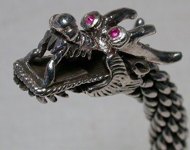 View 2 View 3 View 4 Shaman's Dragon bracelet with ruby eyes a splendid talisman amulet sterling silver Ancient Far Eastern energy sized for 6.5 inch & larger wrist FREE SHIPPING item# DragonBraceletSSwruby $1533.99 each: only also available in 14k 18k 22k gold |