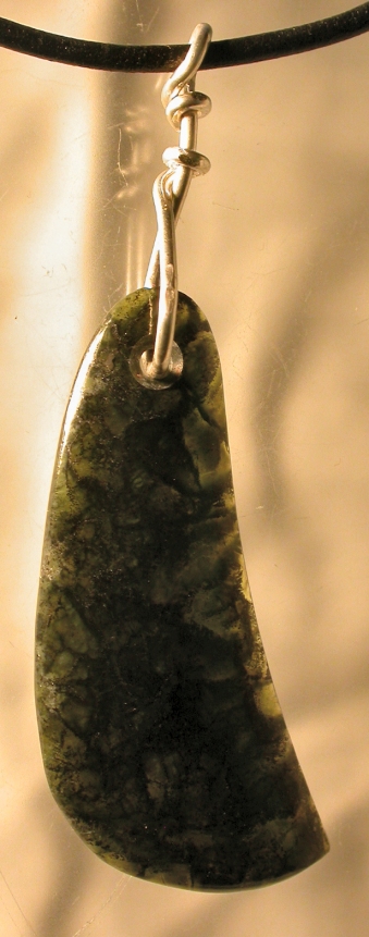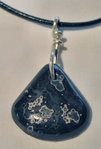 View 2 River Rock pendant Sweetness and happiness in relationship focal point bead Pacific Shamanic energy Jade Cove Big Sur California sterling silver bail adjustable leather necklace included 49 x 25 x 10 mm item# pendrrjc4 $175.99 Order Now to receive FREE SHIPPING! | |