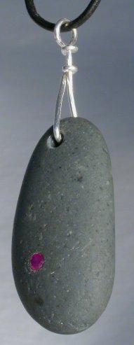 View 2 View 3 River Rock pendant focal point bead inlayed 4 mm Burmese ruby Pacific Shamanic energy Jade Cove Big Sur California sterling silver bail adjustable leather necklace included $1375.99 most other gems can be inlayed inquire for availability & price Order Now to receive FREE SHIPPING! |
