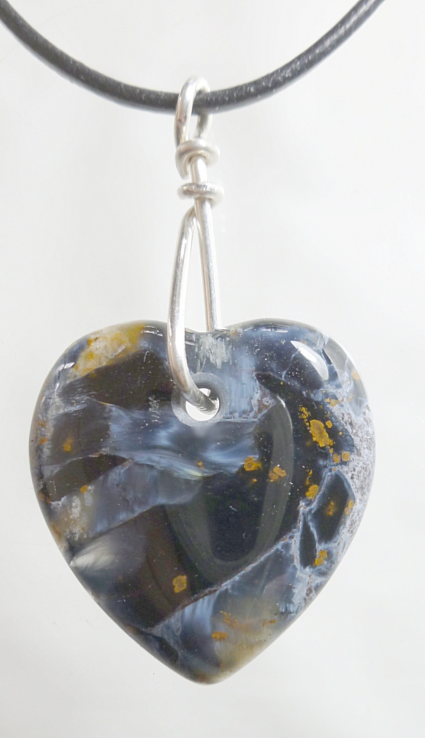 View 2 Pietersite healing heart talisman Deep heart healing celebration Hand carved by Mystic Merchant - Billy Mason 30 x 30 x 5 mm sterling silver bale adjustable leather necklace included FREE SHIPPING item # pieterhrttalis333 $139.99 |