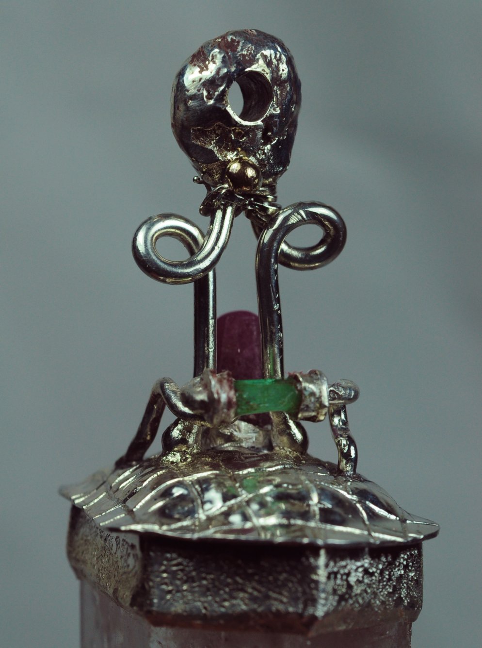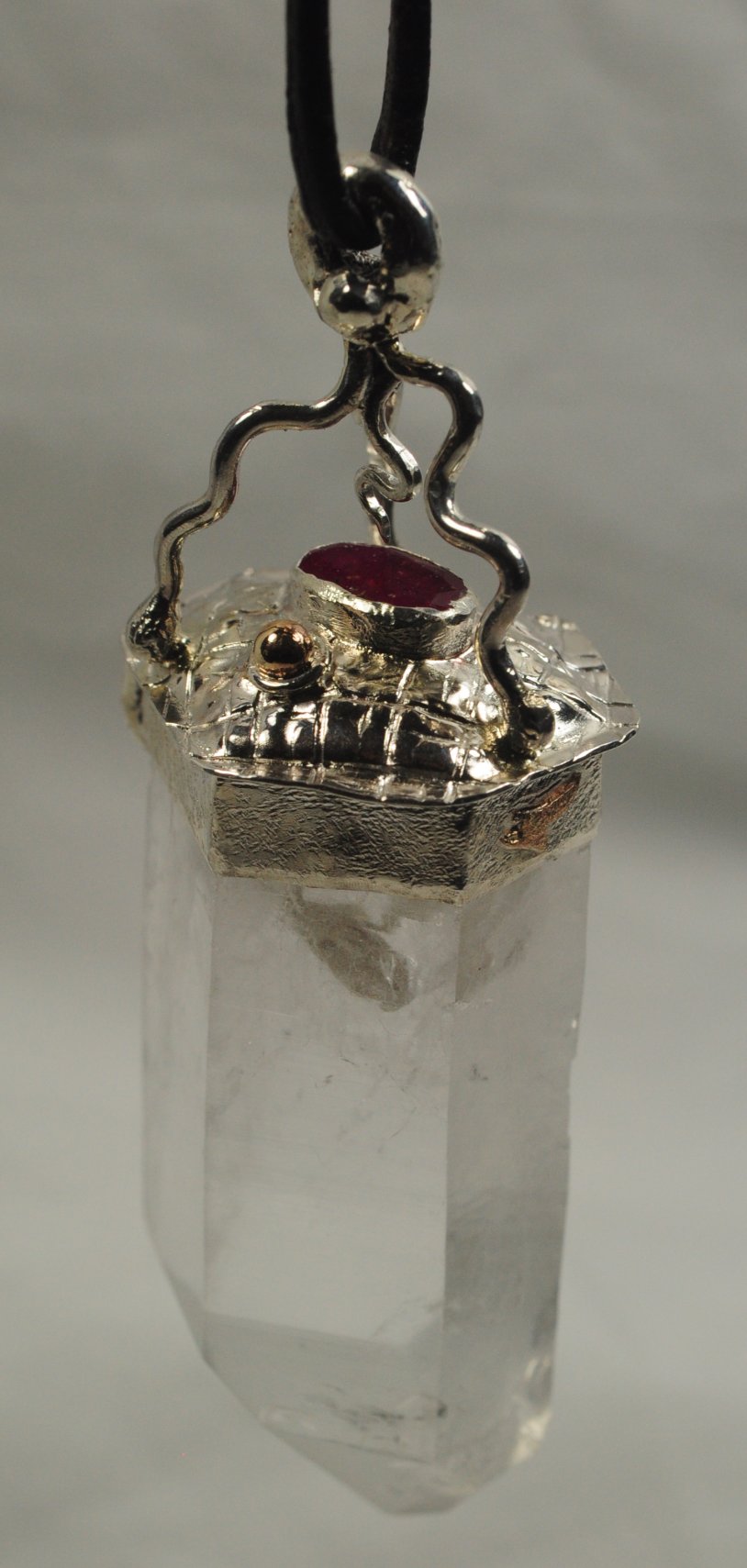 View 2 View 3 View 4 View 5 View 6 View 7 View 8 View 9 View 10 View 11 View 12 Quartz crystal talisman pendulum pendant energy tool fine ruby and emerald multi-recorder Arkansas quartz crystal Amazing Shamanic energy power tool powerful healing meditation tool beautiful to behold soothing to wear and use hand fabricated by Mystic Merchant - Billy Mason sterling silver View 6 shows 14 gold accent eagle & sphere adjustable leather necklace included 83 x 29 x 21 mm FREE SHIPPING item # qrtzcryrubemertalis-1 $3939.99 |