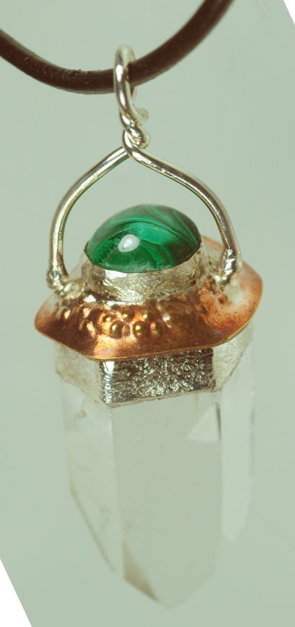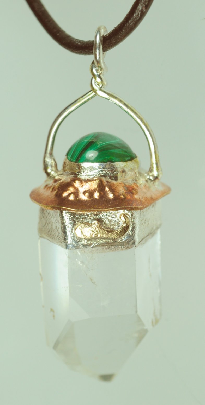 View 2 View 3 View 4 View 5 View 6 Recorder quartz crystal talisman pendant chatoyant malachite emitter in crown Shamanic chakra opening & healing tool repousse & chased bronze and sterling silver cap 14k carved gold whale detail hand fabricated by Mystic Merchant Billy Mason 55 x 17 x 15 mm sterling silver bail adjustable leather necklace included item # qrtzmalachitetalis101 $473.99 SOLD |